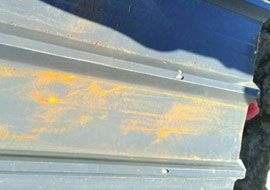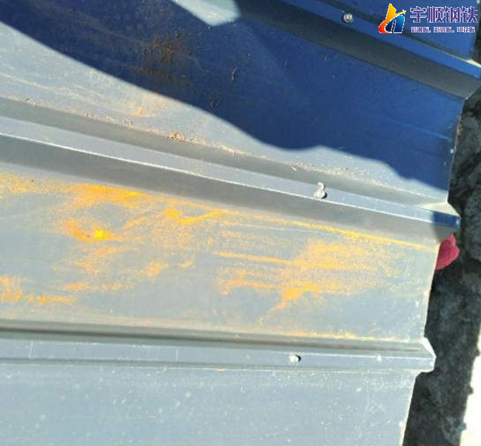 看完這些圖片以后,我松了一口氣,也知道了這批彩鋼板生銹的原因以及處理辦法。首先說這批彩鋼板生銹的原因,大家仔細看圖片,這些銹跡有的地方厚,有的地方博,形狀形容起來就像掃地沒有掃凈留下的道道灰塵痕跡,而且彩鋼板表面不是大面積或者全部生銹,都是局部的銹痕。造成這批彩鋼板生銹的原因就是:安裝工人在安裝彩鋼板時,沒有及時處理掉彩鋼板表面打孔和切割時留下的鐵屑沫子,導致一場雨后,鐵屑遇水,彩鋼板表面生銹。說到這里有的用戶會問,我安裝既沒有處理鐵屑沫子也沒有下雨,安裝很久以后下雨為什么生銹,鐵屑這段時間難道不會自己掉落或被風吹落嗎?這里告訴你,在安裝彩鋼板時候產生的鐵屑有大有小,但是都很難被風吹落,應為大的鐵屑風吹不走,小的鐵屑卻有一定的吸附力,這就是為什么安裝當時不處理,過后很久下雨也會生銹的原因!