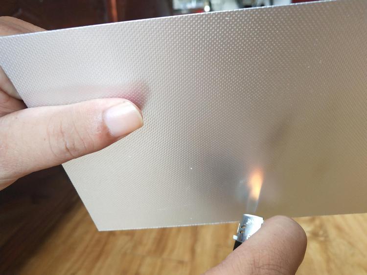 將98%濃硫酸溶液同時將滴到納米防腐板和普通彩鋼板進行測試。右側圖片為98%濃硫酸浸泡五分鐘后的效果,普通彩鋼板涂層已完全腐蝕脫落,而納米隔熱防腐板納米抗老化PET膜依然無任何變化。